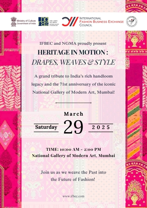On behalf of the International Fashion Business Exchange Council (IFBEC), it’s a pleasure to invite your esteemed institution to be a part of an exclusive event that pays tribute to India’s rich and enduring handloom heritage. We are hosting "Heritage in Motion: Drapes, Weaves & Style" at the iconic National Gallery of Modern Art, Mumbai.